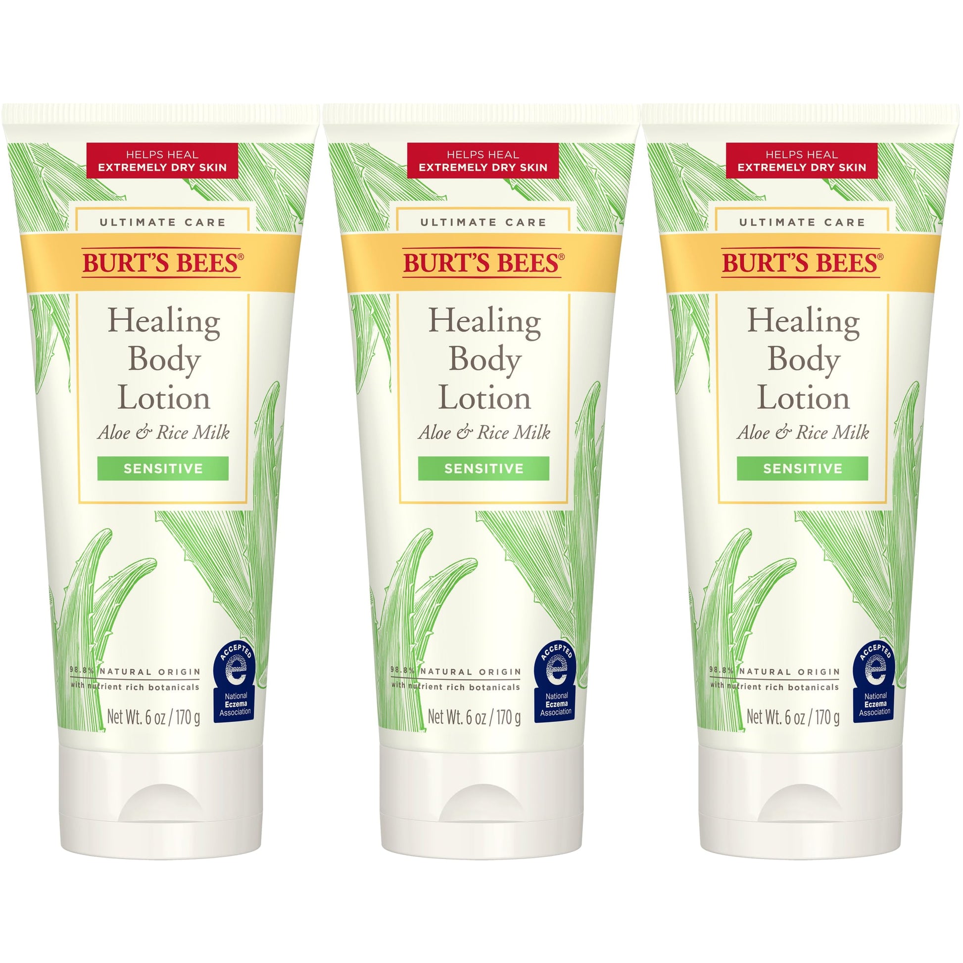 Details: Get head-to-toe care for extremely dry, sensitive skin. This fragrance-free formula pairs skin-soothing Aloe and Rice Milk with nourishing Jojoba Oil and Shea Butter. Its clinically shown to provide all-day moisture to help heal extremely dry skin and help restore the skins moisture barrier. This gentle body lotion was developed by dermatologists and has received the National Eczema Association Seal of Acceptance. Burt's Bees Ultimate Care Healing Body Lotion with Aloe and Rice Milk for Sensitive Skin is 98.8% natural origin and is formulated without parabens, phthalates, petrolatum or SLS. This Burts Bees body lotion for extremely dry skin is also Leaping Bunny Certified, while the squeeze bottle packaging is recyclable with Terracycle. To use, simply apply liberally as often as needed. Burts Bees proudly practices responsible sourcing for our ingredients from nature. See how Burts Bees turns ingredients from natural origin into gentle and effective nourishment for even the most sensitive skin.