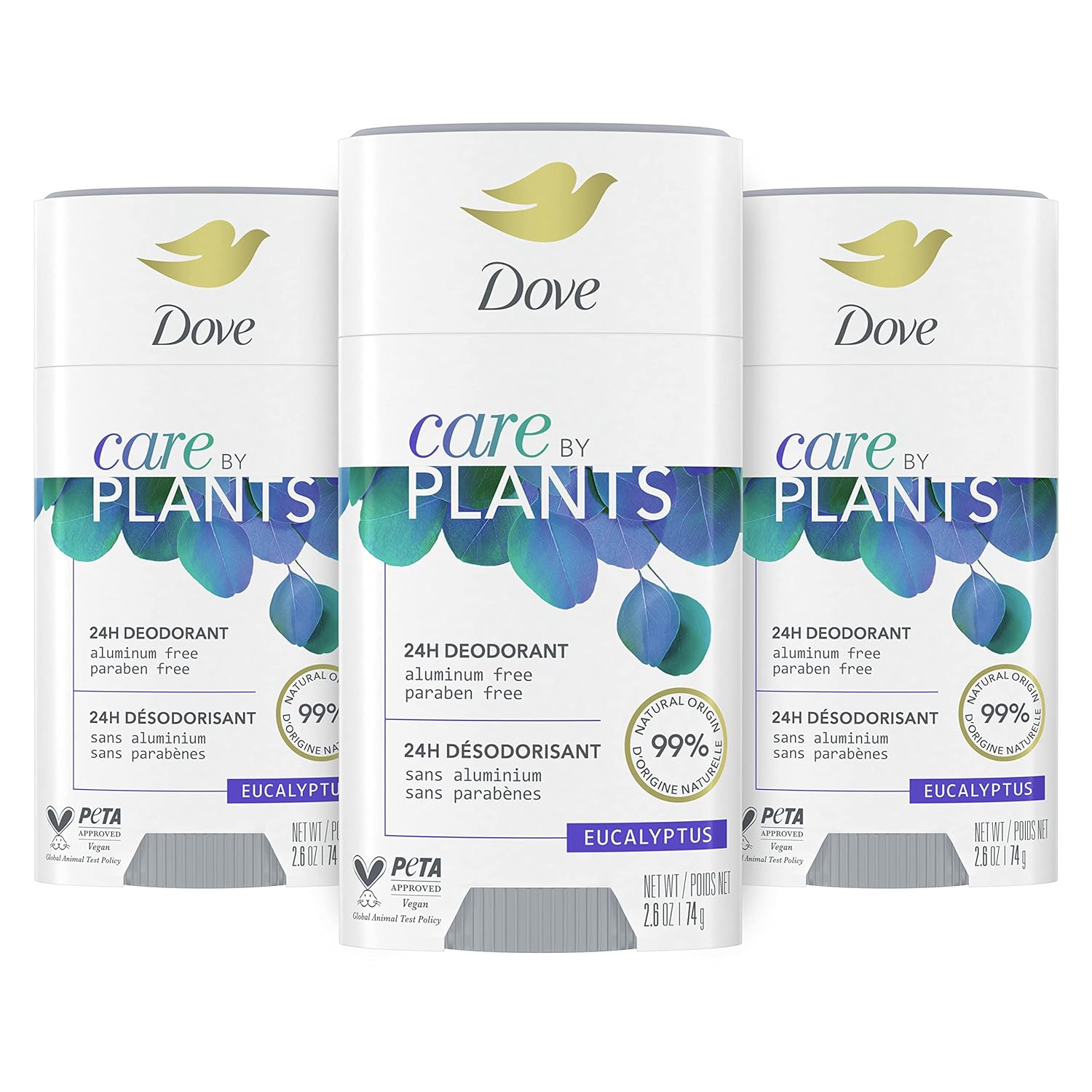 Dove Care by Plants Deodorant Stick for underarm skin care and 24 hour deodorant protection Eucalyptus no aluminum deodorant, 2.6 oz - Pack of 3