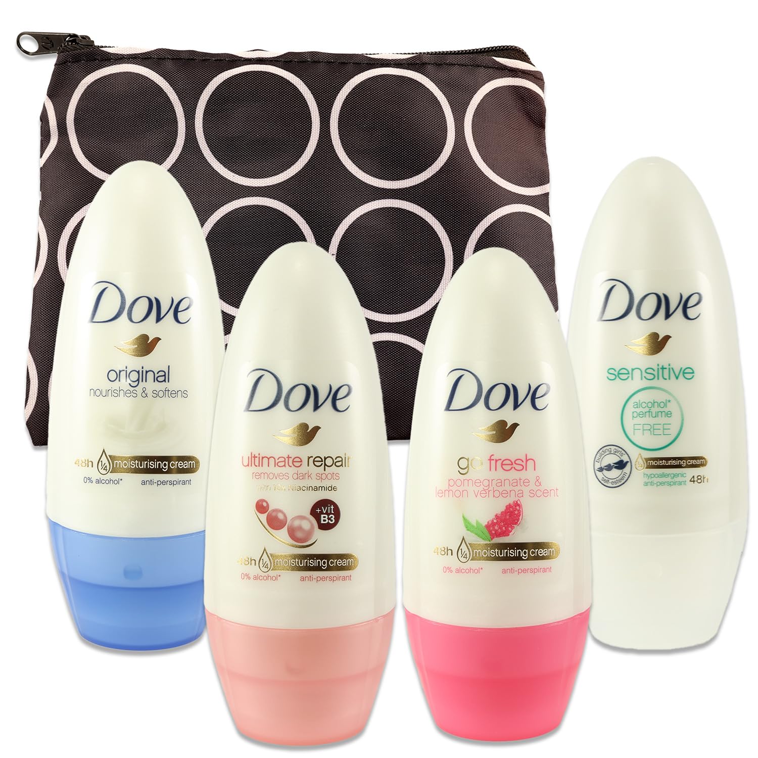 Dove Roll on Deodorant Variety Pack - Dove Deodorant Variety Pack Bundle with 4 Travel Size Deodorant Dove Roll On with 1.4 oz Plus Travel Bag | Original, Fresh Scent, Sensitive Skin, Ultimate Repair.