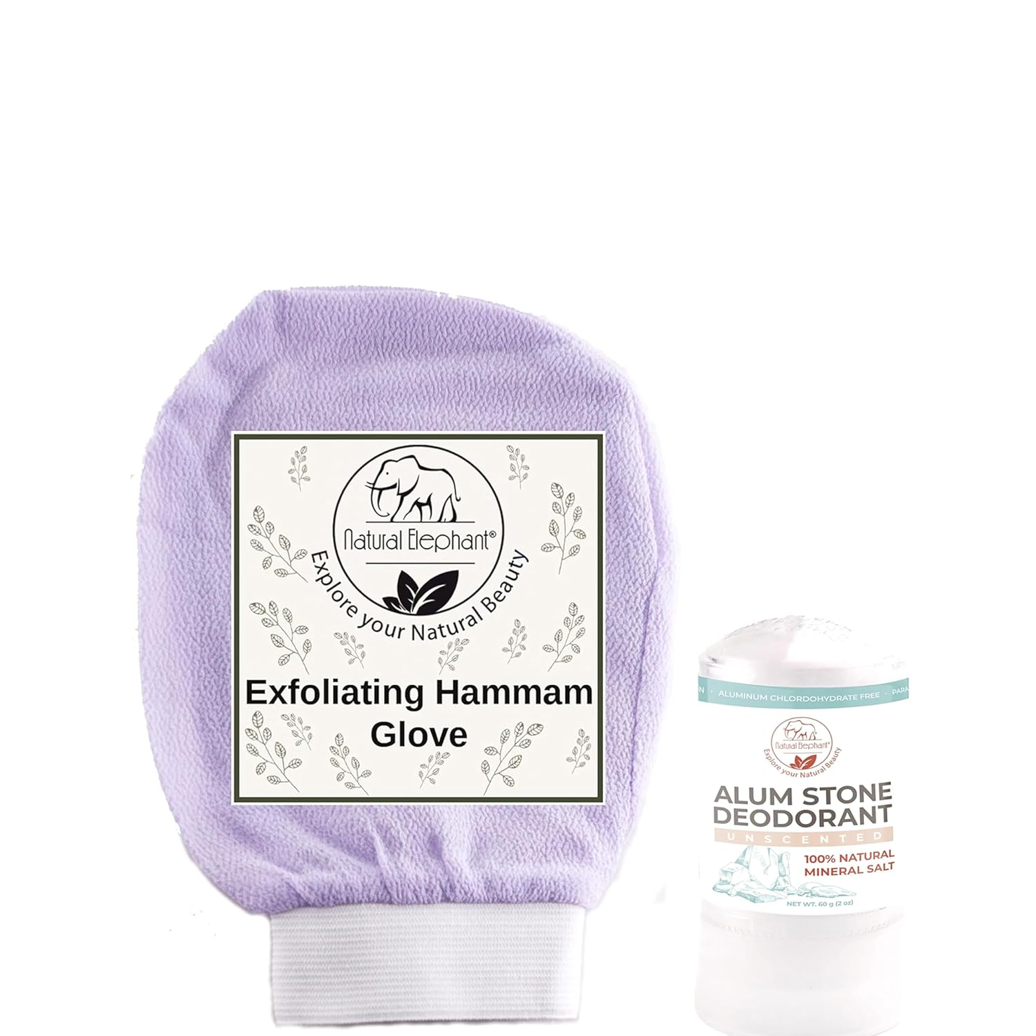 Freshness & Renewal Bundle: Natural Elephant Alum Stone Deodorant Stick and Exfoliating Hammam Glove Lilac
