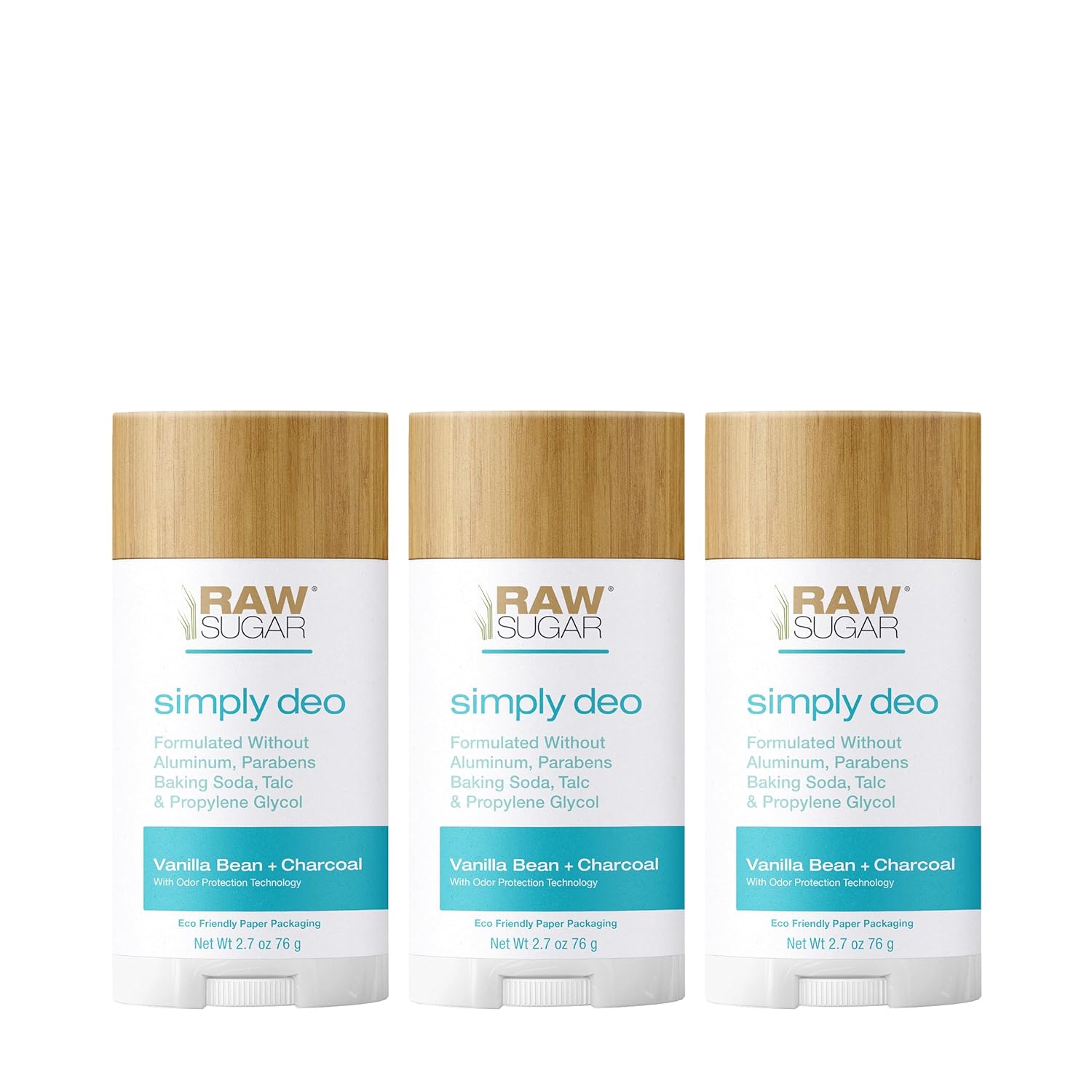 Raw Sugar Aluminum Free Deodorant Stick, Simply Deo Bundle (Pack of 3) Whole Body Deodorant for Women & Men, Clean Formulated without Baking Soda, Talc & Parabens, Vanilla Bean + Charcoal Scent